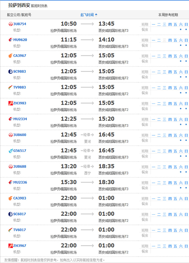 以上就是拉薩飛西安的航班時(shí)刻表,起飛時(shí)間,到達(dá)時(shí)間,及固定航班日期。>>相關(guān)閱讀:西安到拉薩飛機(jī)航班時(shí)刻表